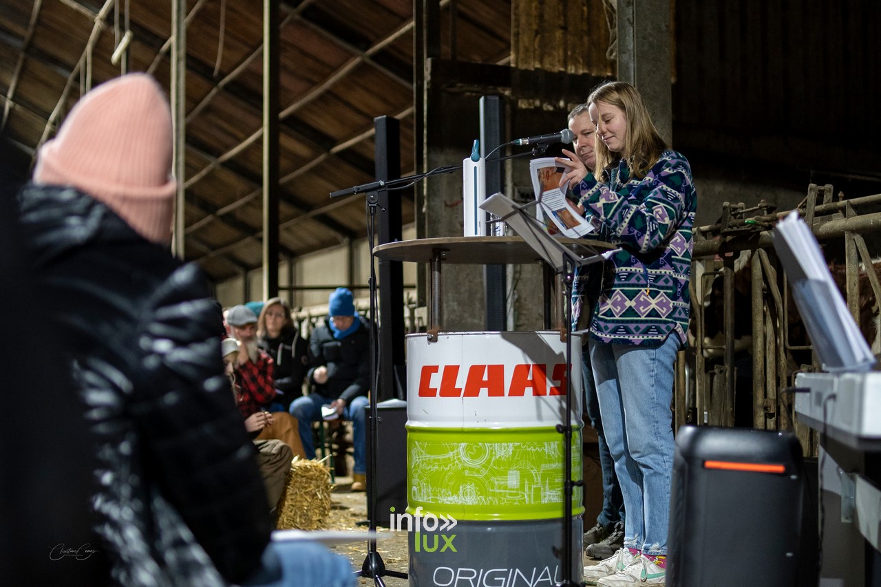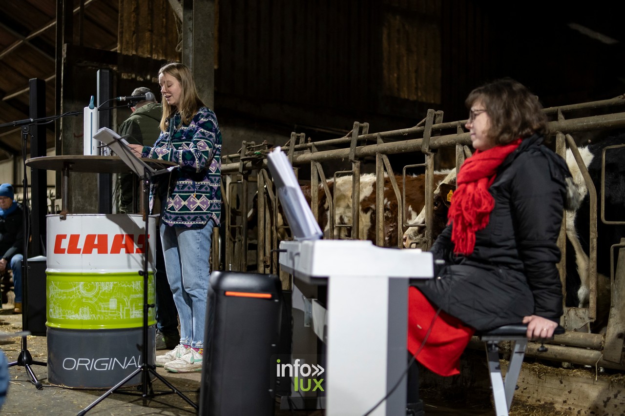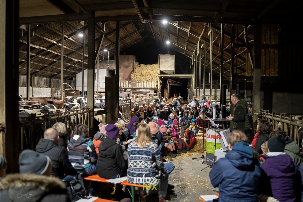 À Goeblange, l’étable de Luc Mangen s’est transformée en un lieu enchanteur pour accueillir la troisième édition de cette veillée. Décorée avec soin, la grange offrait une atmosphère chaleureuse, entre bottes de paille, lumières tamisées et sons des animaux environnants.