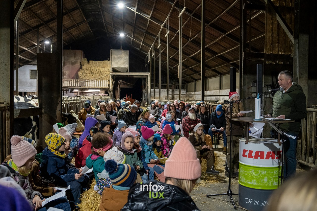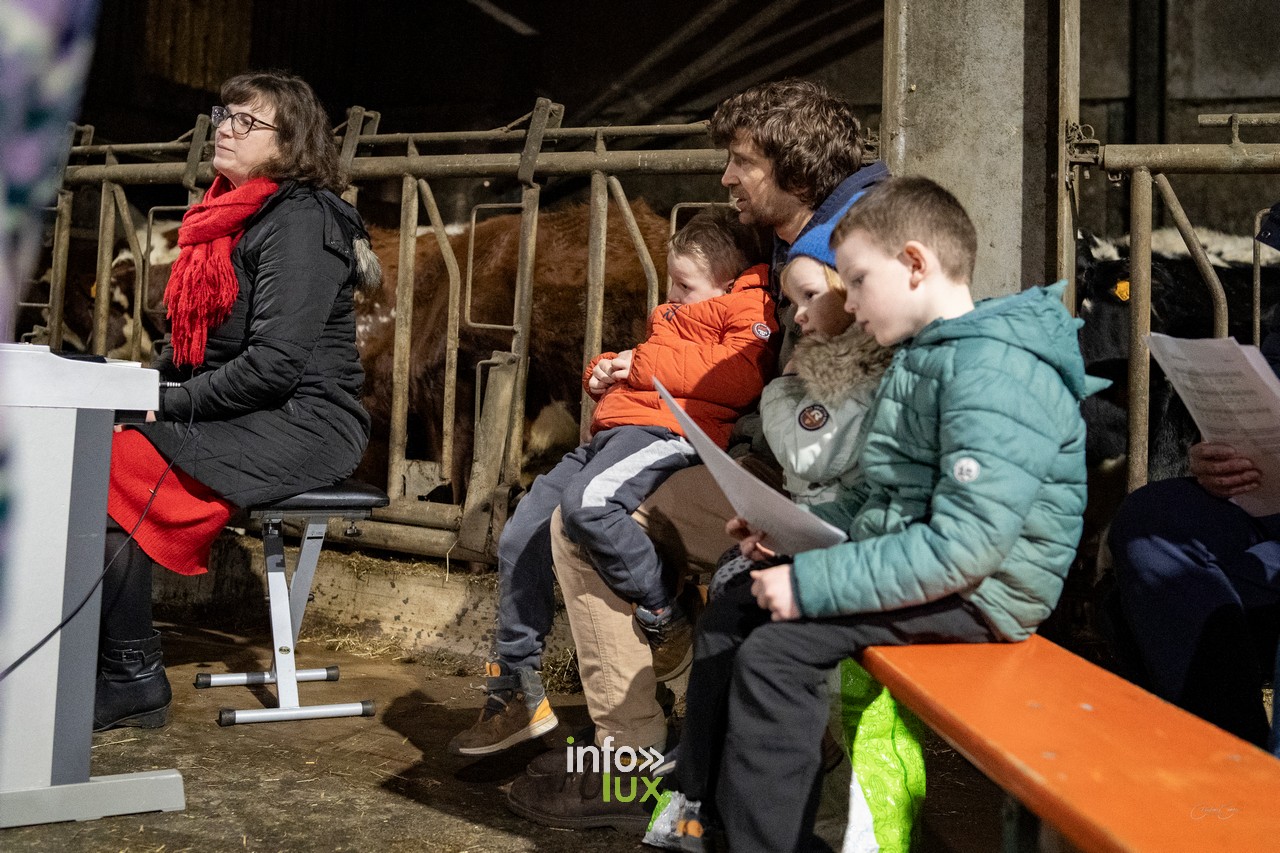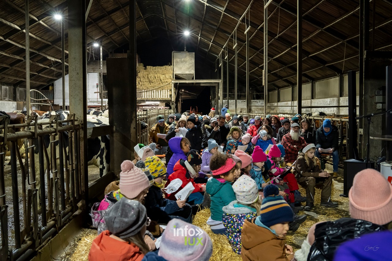 À Goeblange, l’étable de Luc Mangen s’est transformée en un lieu enchanteur pour accueillir la troisième édition de cette veillée. Décorée avec soin, la grange offrait une atmosphère chaleureuse, entre bottes de paille, lumières tamisées et sons des animaux environnants.