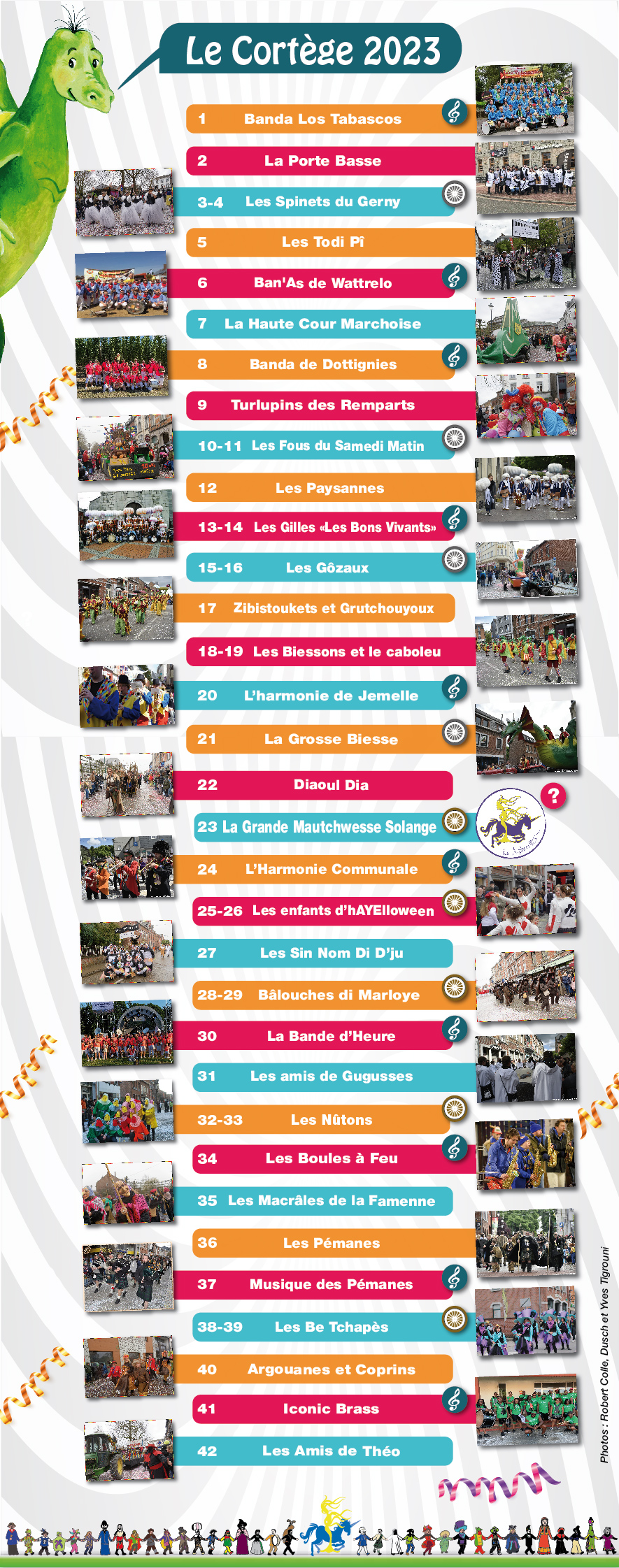 Outre Solange la Grande Mautchwesse et les Aphrodites, Les Gôzaux, la Haute Cour Marchoise, les Sin Nom Di D’ju, les Baloûches di Marloye, les amis du Gugusse, les Spinets du Gerny, la Porte Basse, les Todi Pî de Lignières, les Turlupins des remparts, les Diaoul Dia, les Nûtons, les Zibistoukets et Grutchouyoux, les Pémanes, les Macrâles de la Famenne, la société des Gilles “Les Bons Vivants” et leurs paysannes, les enfants d’hAyelloween, les Argouanes et Coprins, les Amis de Théo, les Bé Tchapès, Les fous du samedi matin, l’harmonie communale de Marche ET la Grosse Biesse avec ses Biessons, le cortège sera composé de sociétés locales dont groupes et chars rivaliseront pour le concours.