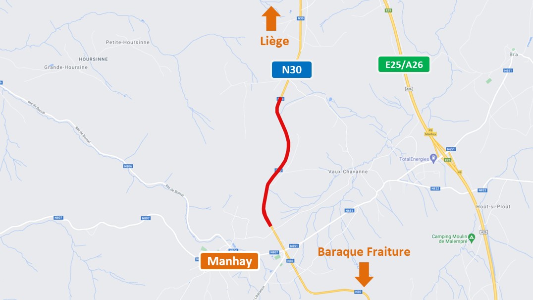 - Les usagers circulant en direction de Liège, seront déviés vers l’E25/A26 via la N651.